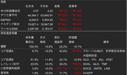 DeepSeekショック、トランプ関税、FOMC利下げ停止などネガティブなニュースが多かった1月ですが、ダウ工業平均の+4.7%を筆頭に各株価指数は前月末から上昇しました。 保有資産は継続積立のVTIのほかGLDにも追加投資を入れ、JNJ、AT&Tが好決算で+4%から+5%上…