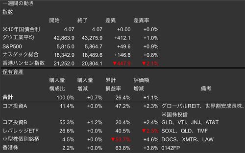 Nvideaショックで大きく揺れた半導体をTSMCが救ったような一週間でした。SOXLがやられてしまい、レバレッジETFがへこみましたが全体の資産額ではGLDの追加投資を含めて+1.1%の増加となりました。 累計損益は26%を超え、今年7月以来となりました。このまま年…