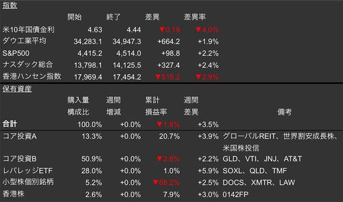 保有資産の評価損益がプラスの0.3%となり、2022年4月1日以来のプラスとなりました。J&Jが決算発表後に大きく上昇し、貢献しました。市場全体でもナスダックが下がる一方でダウが好調を維持していますが、私の保有資産も半導体、ナスダックのレバレッジセグメ…